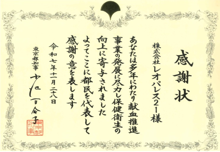 レオパレス21、「献血功労者 東京都知事感謝状」を授与されました